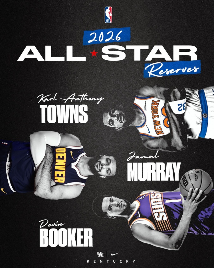 肯塔基男篮官方社媒更新动态,祝贺三位校友贾马尔·穆雷、布克还有唐斯入选全明星替补阵容。